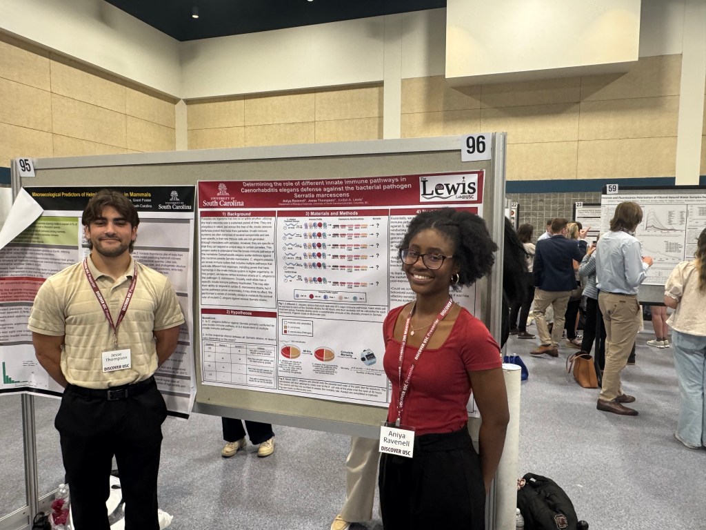This past Friday, Aniya and Jesse presented their semester research project at Discover USC, the campus-wide graduate research conference. They did a great job and received lots of compliments on their presentation skills from the judges and other attendees. We are looking forward to finishing up data collection and seeing where the project goes! This is the first official presentation of the Lewis Lab!